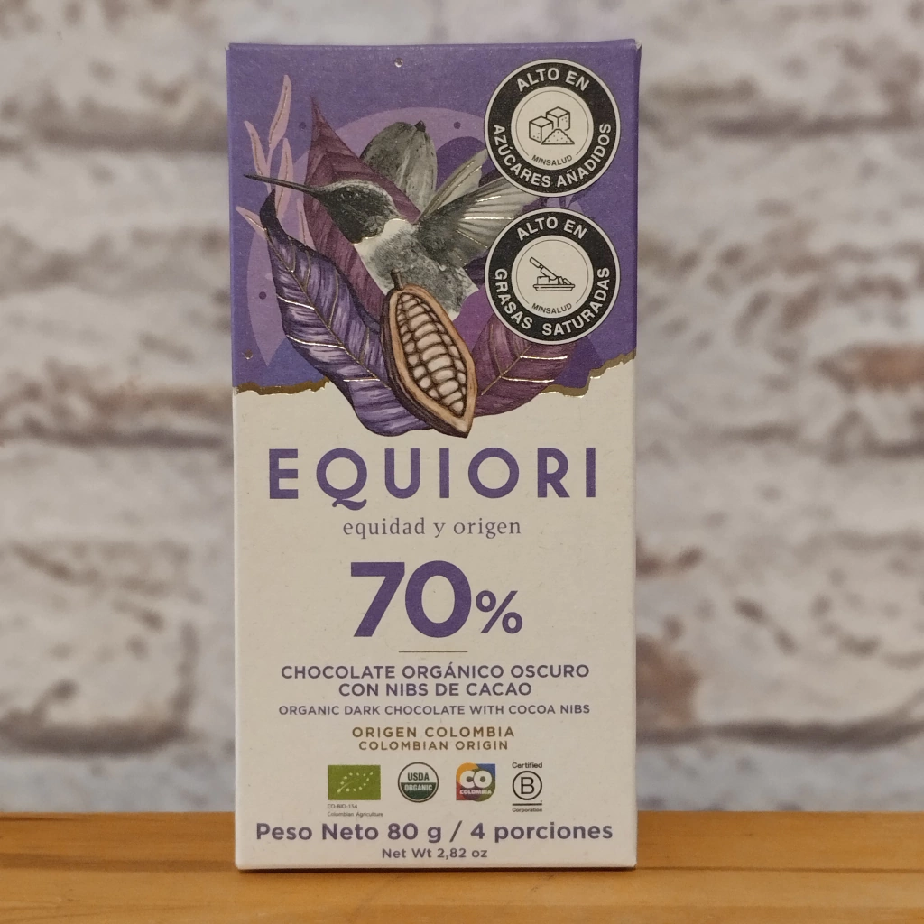 Barra de 80 gr de chocolate orgánico y vegano con 70% de cacao, recubierto con nibs en trozos del mismo cacao y endulzado con azúcar orgánica.